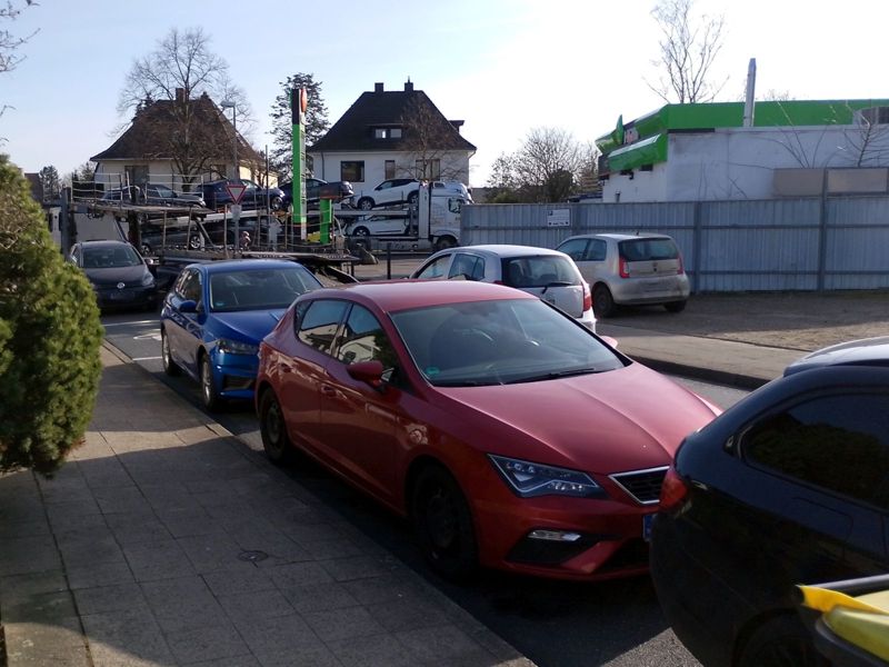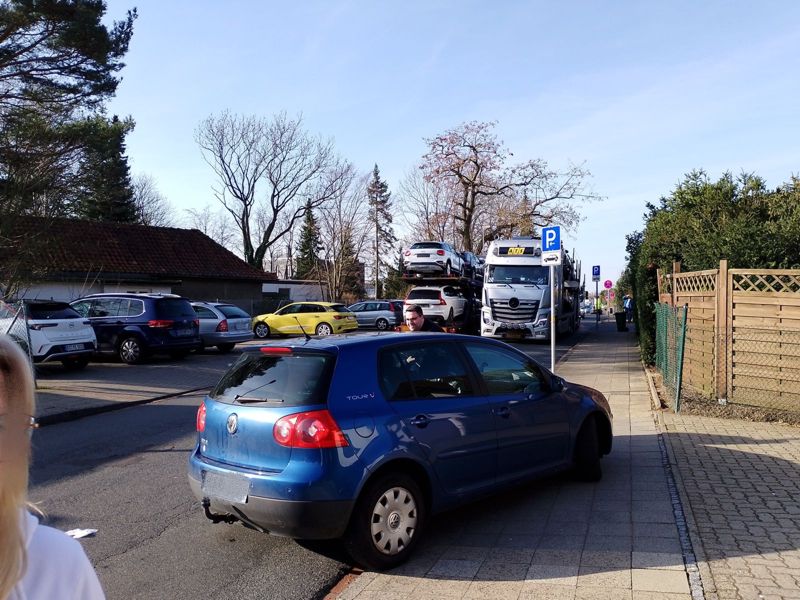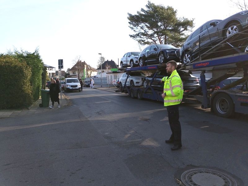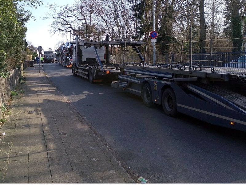 mehrmals laden oder entladen Autotransporter auf der Straße oder halb auf dem Gehweg, auch im absoluten Halteverbot.